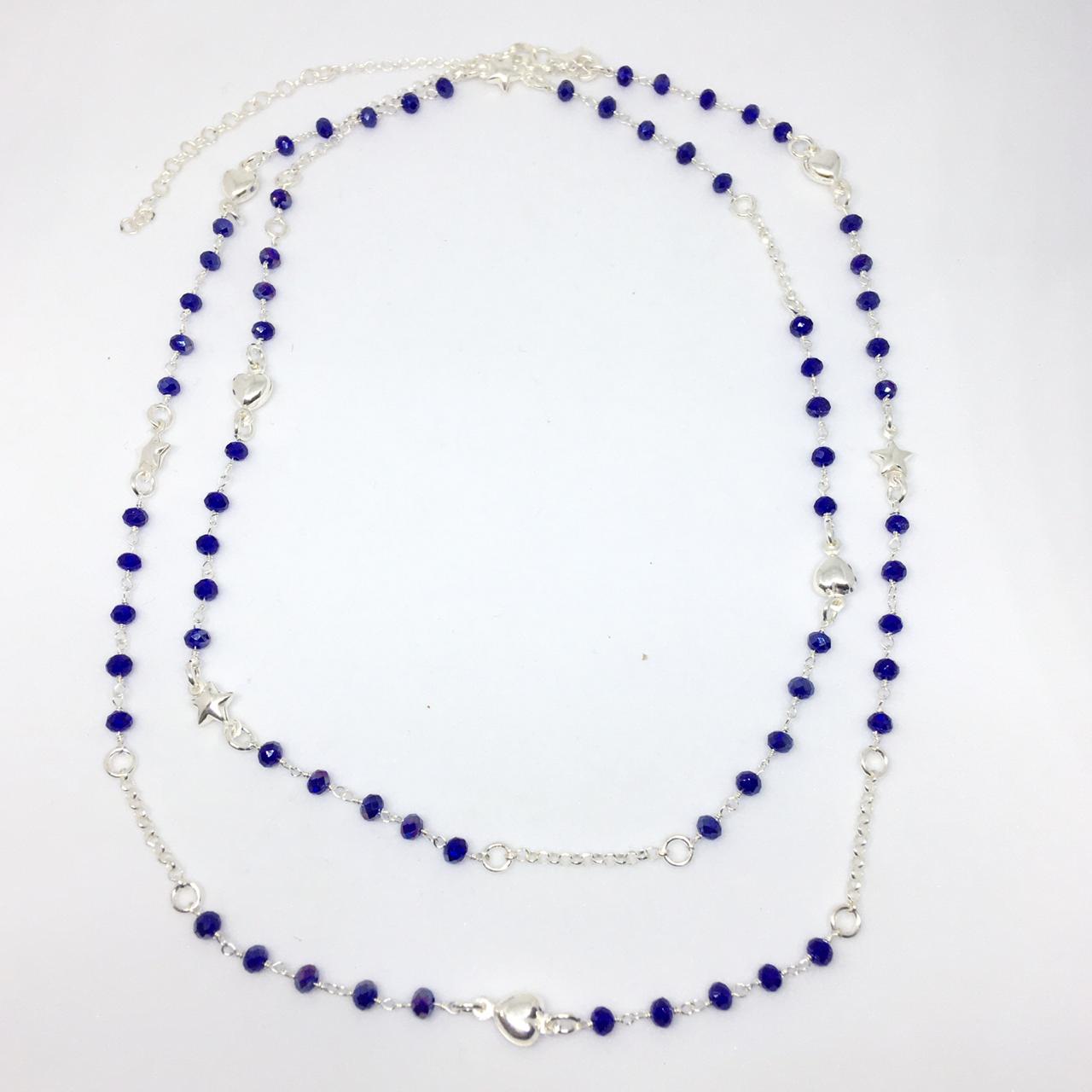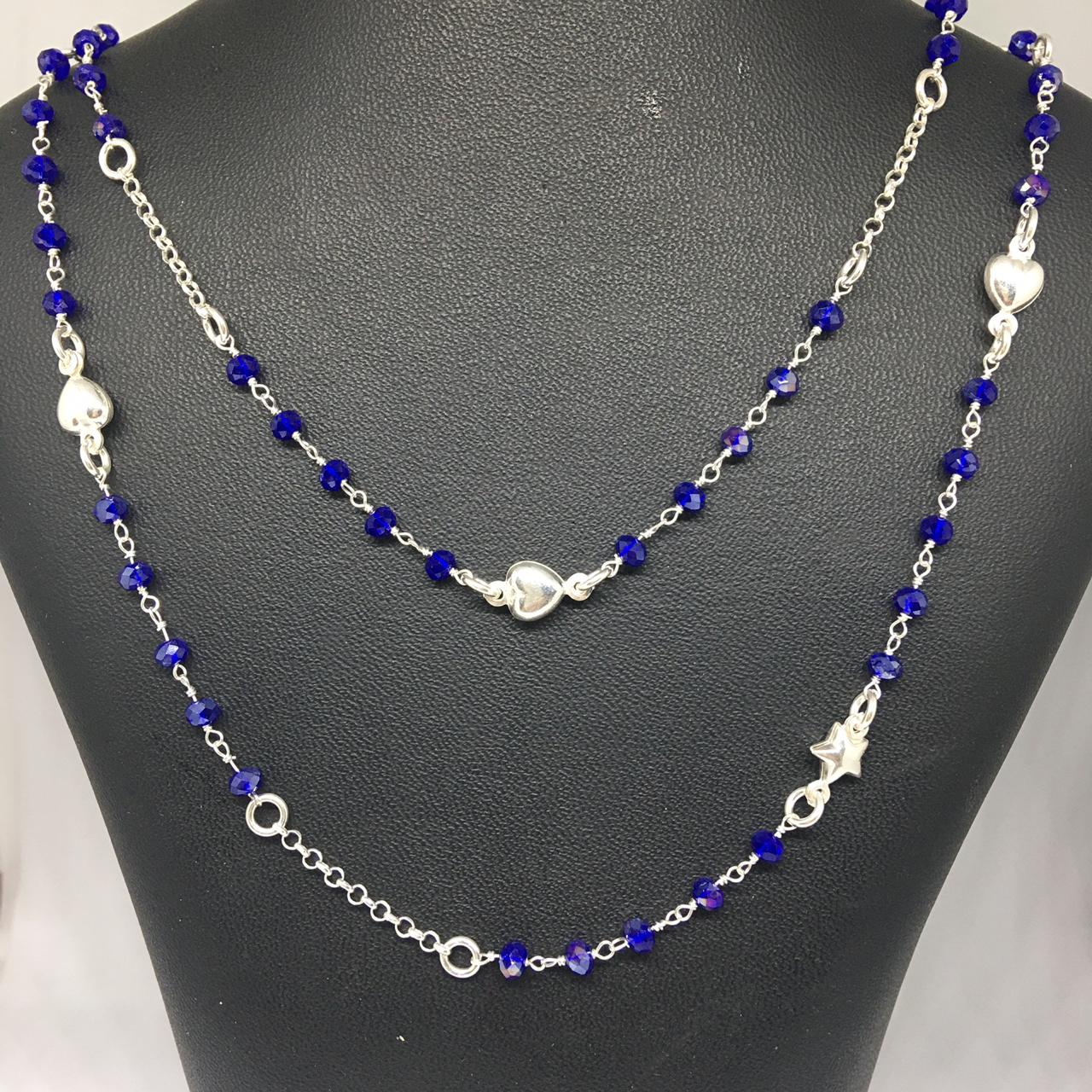 Collar de plata con cristales azules ,dijes corazones y estrellas, 80cm