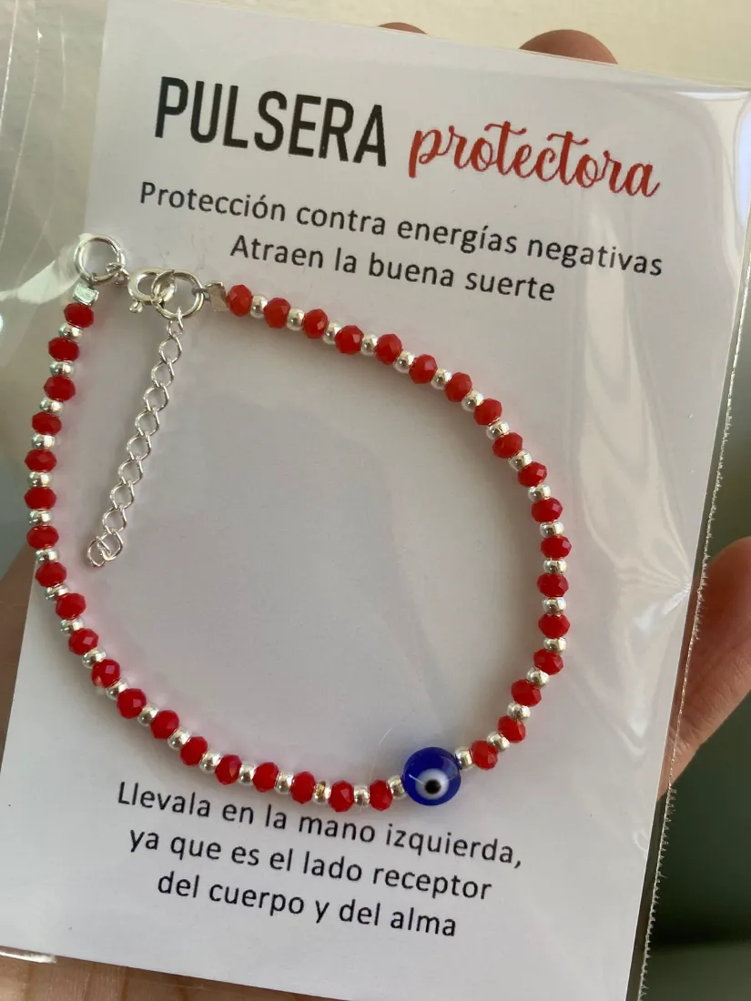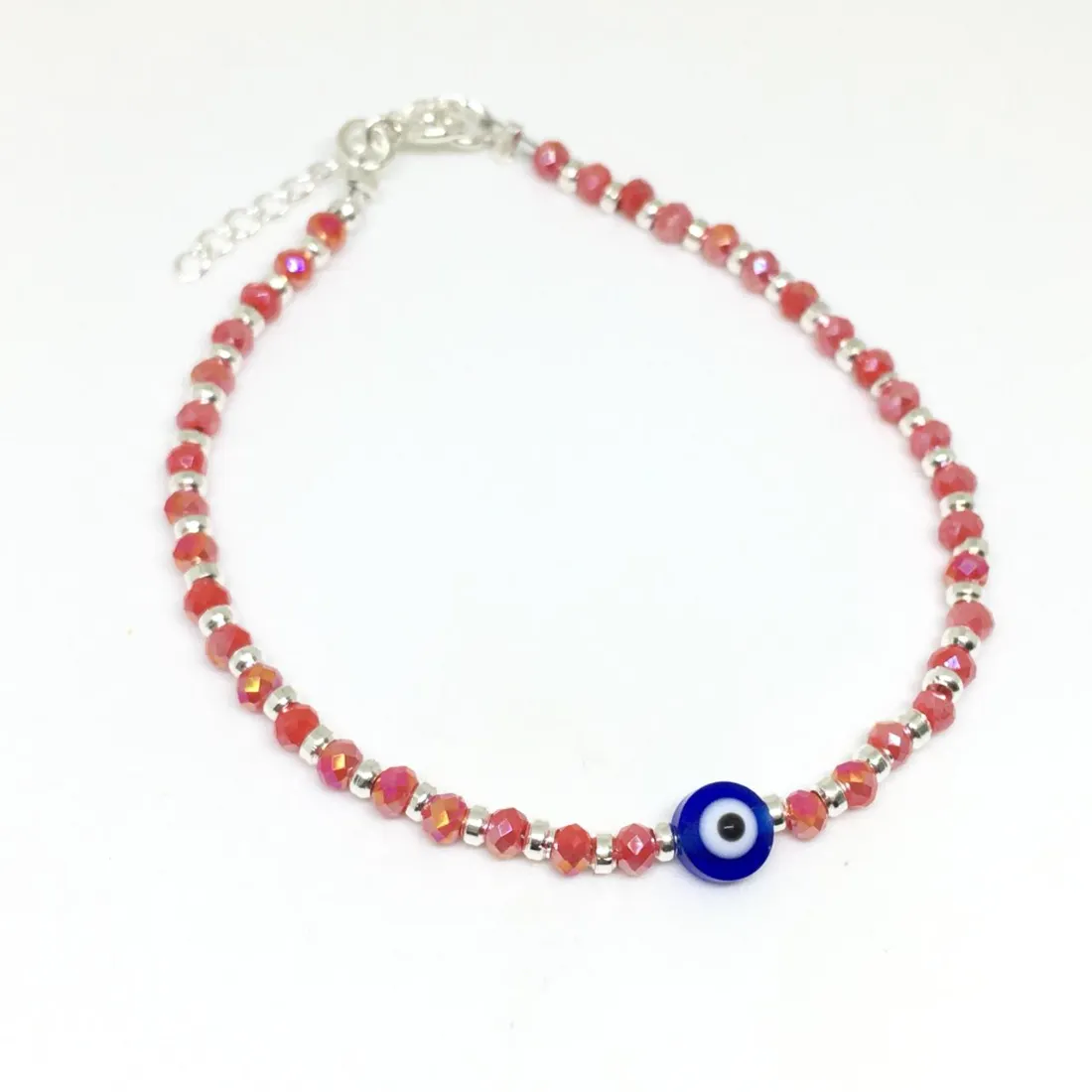 Pulsera de plata y cristal rojo con ojo turco (tarjetita) - 18+3cm