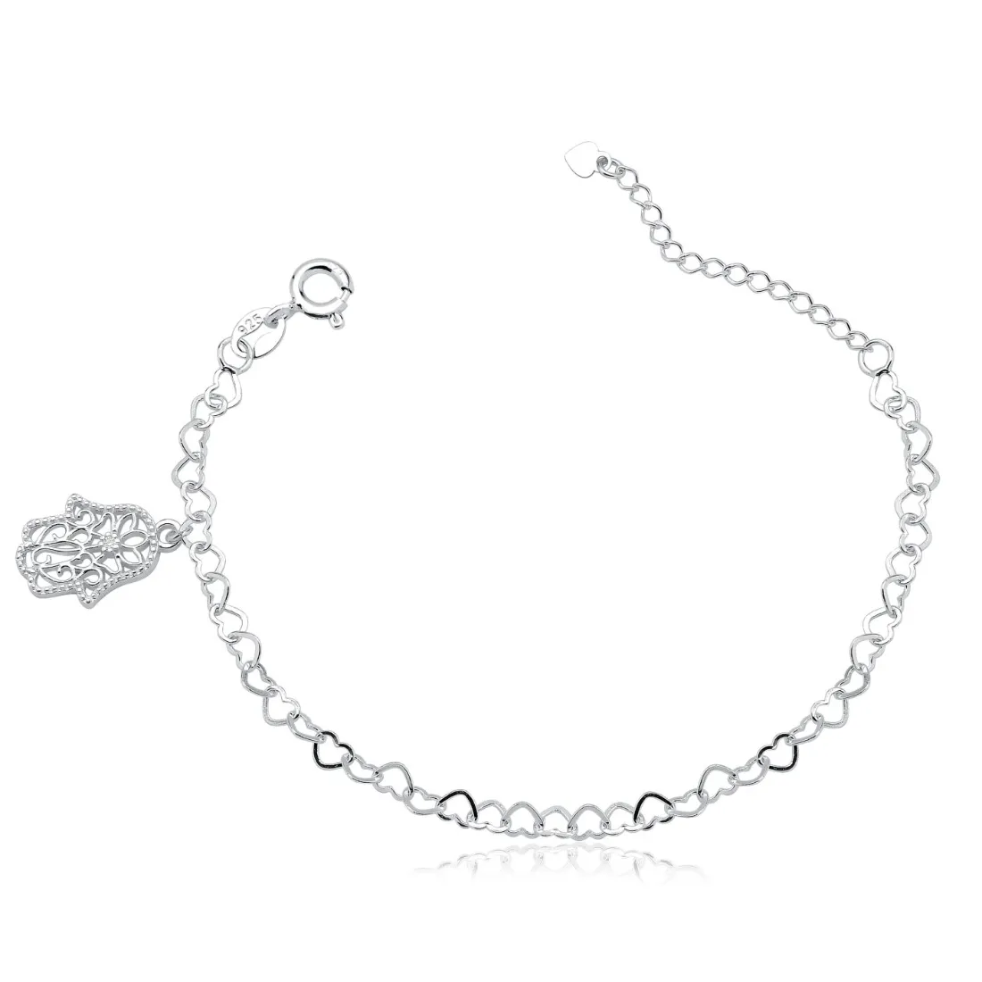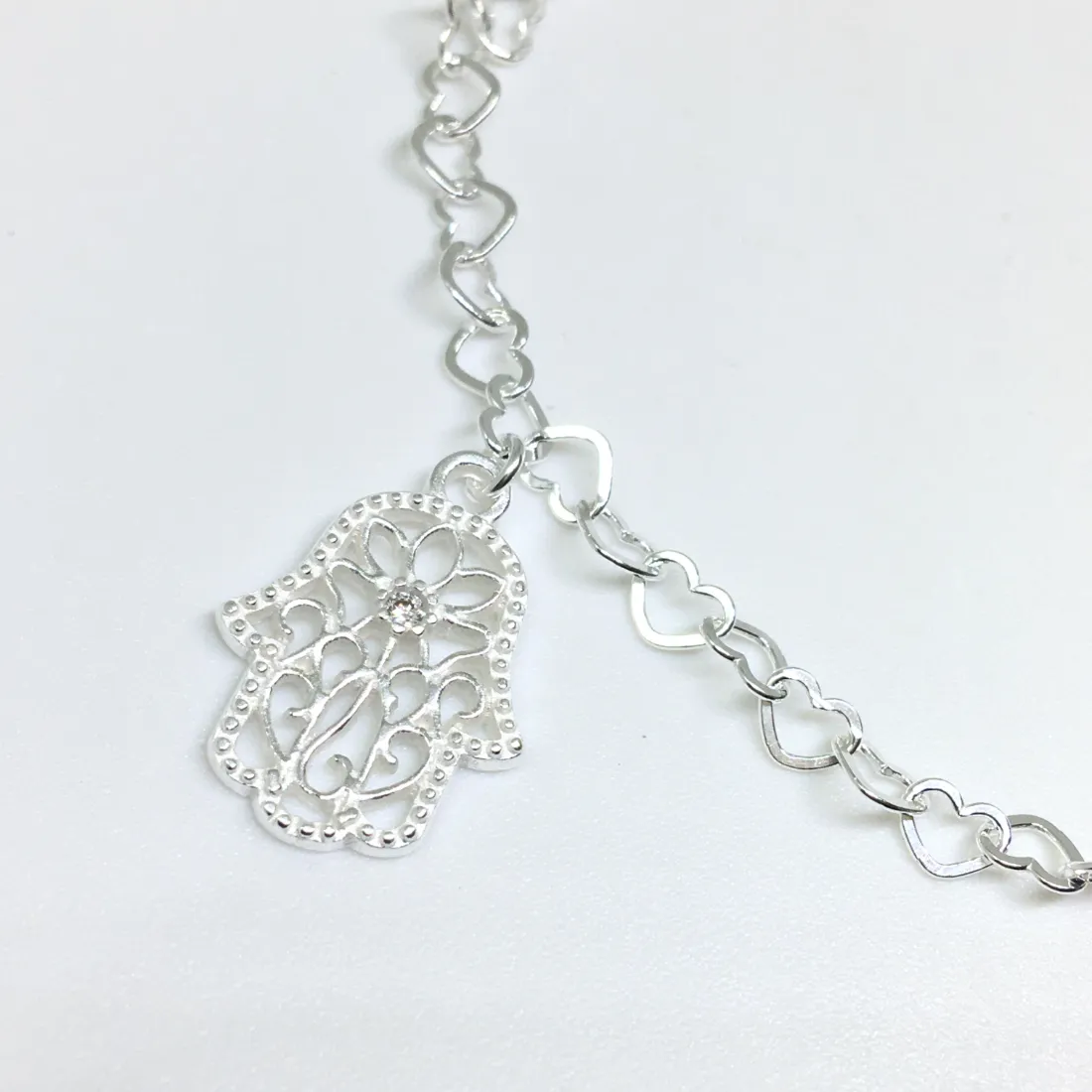 Pulsera de plata corazones con dije mano hamsa 16 + 3cm